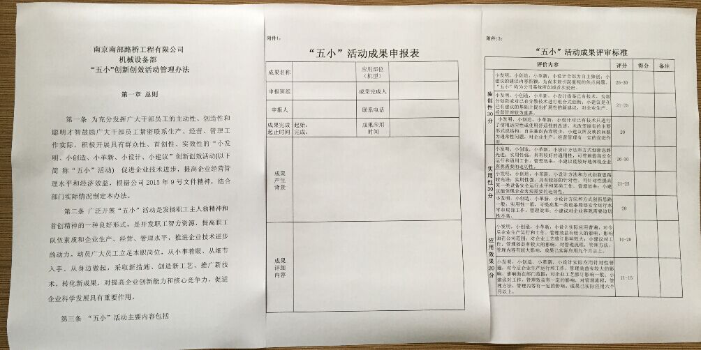 7月5日,活动评审小组对2015年上半年度“五小”活动成果进行了评比,评比方式为对成果的独创性、实用性、应用效果、技术水平、推广前景五方面进行评分。根据评分及综合分析,评选出了前三名,第一名:洒水车吸水装置改装;第二名:设备夜间停放安全指示灯加装;第三名:胶轮压路机前后凸镜加装。部门在近期将评选结果上报公司,经同意后,将对成果完成人进行奖励。