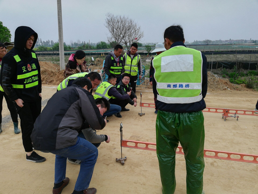 2018年4月4日下午,市质监站委托的检测公司对我部施工的路床顶进行现场交工验收检测。(柳庆国)