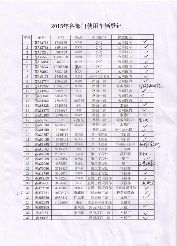 此次检查由常务副总诸定鸣牵头,公司综合办、安资部相关人员参加,分别对公司本部、直属工程项目部、第一工程处、第三工程处、路面项目一部、路面项目二部、机械设备部、路寰综合施工部的车辆使用和停放进行了专项检查。